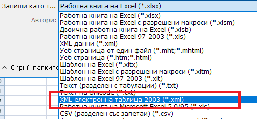 След като сте се уверили, че сте изпълнили горните условия, проверете дали в първия ред има антетка и ако има изтрийте реда. След това в Excel изберете "Запиши като" (Save As ...) от главното меню и изберете за формат на файла "XML електронна таблица 2003 (*.xml)".
